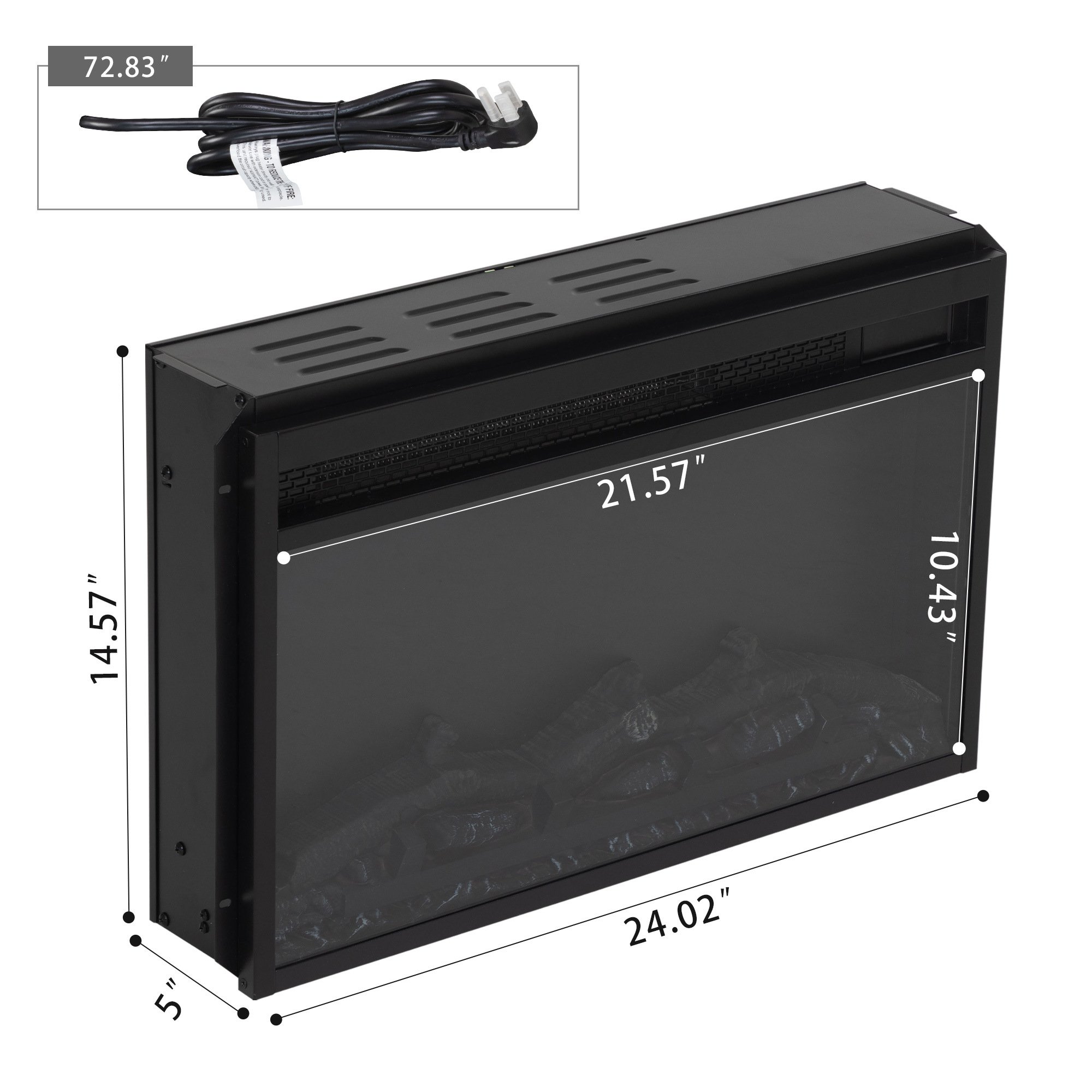 23 inch electric fireplace - black&Nbsp;Material: iron sheet+glass+resin simulated charcoalColor: black iron sheet+red yellow flameThe overall size of the product is 61 (L) * 12.7 (W) * 37 (H) cm, and the glass size is 54.8 * 26.5; With a wire plug, the total length of the wire plus plug is 185cmPower parameters: 1400W, 120V, AC 60HZ;Function: The product can be adjusted by the remote control or touch control panel, with three flame modes+separate flame shutdown, temperature adjustment setting (64 ° F to 82 ° F), timing setting, and overheating protection function. The flame effect can operate independently without heating function&Nbsp;Note: The product comes with a user manual