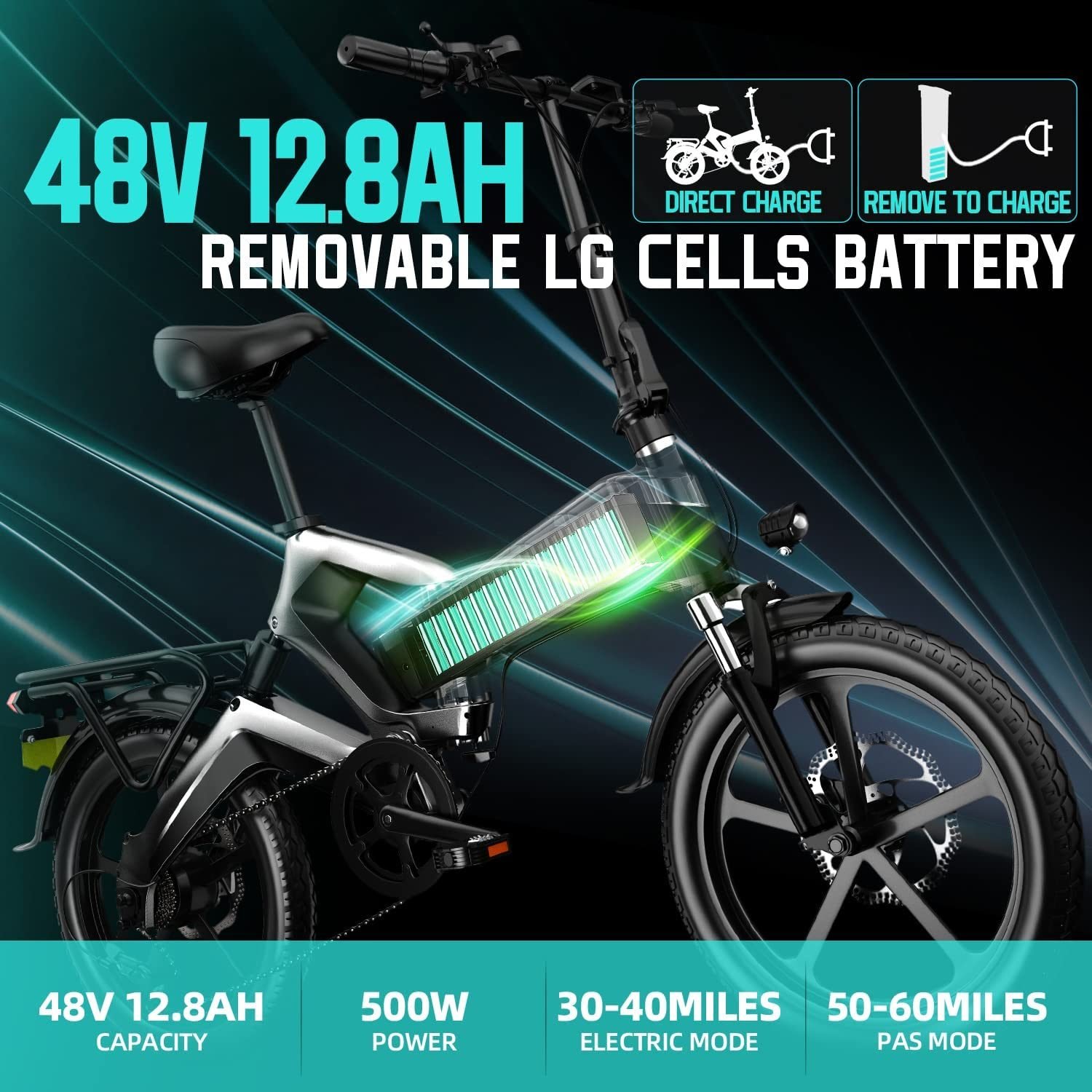 2.LG 48V12.8AH Removable Lithium Battery: The battery of this e bikes for adults electric is made of 18650 power cells, LG 48V 12.8Ah large capacity, ensuring your range up to 23-30 miles in electric mode, and 35-40 miles in pas mode. The battery is removable and can be charged indoors.