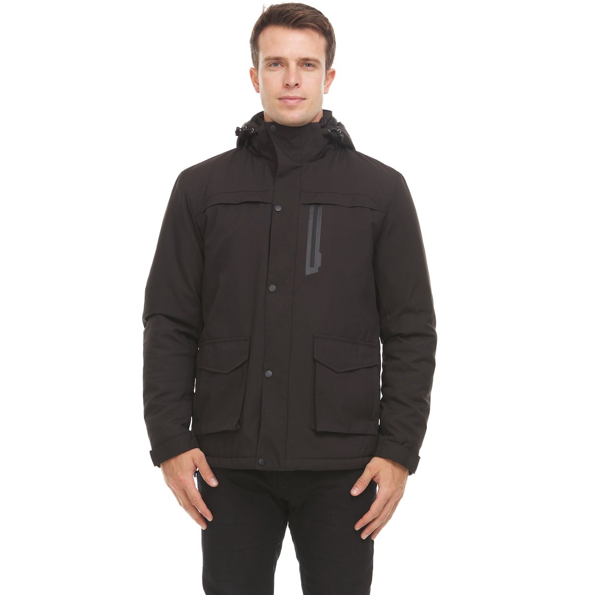 Designed with a detachable hood for all year wear, front pockets, covered zipper, and adjustable Velcro closure around the wrists provide comfort and style.