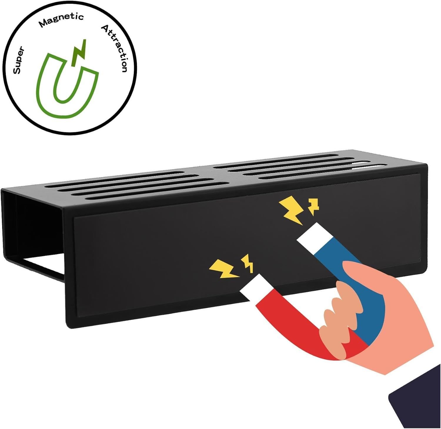 1.Sturdy metal,painting finish,rust-proof,corrosion-resistant No drilling or assembly required Super strong magnet on the back Adsorbable on other metal surface 1 shelf supports up to 12 normally spice jar,bearing up to 11 lbs Package including 4 pieces metal black magnetical shelves(2 large,2 Medium)