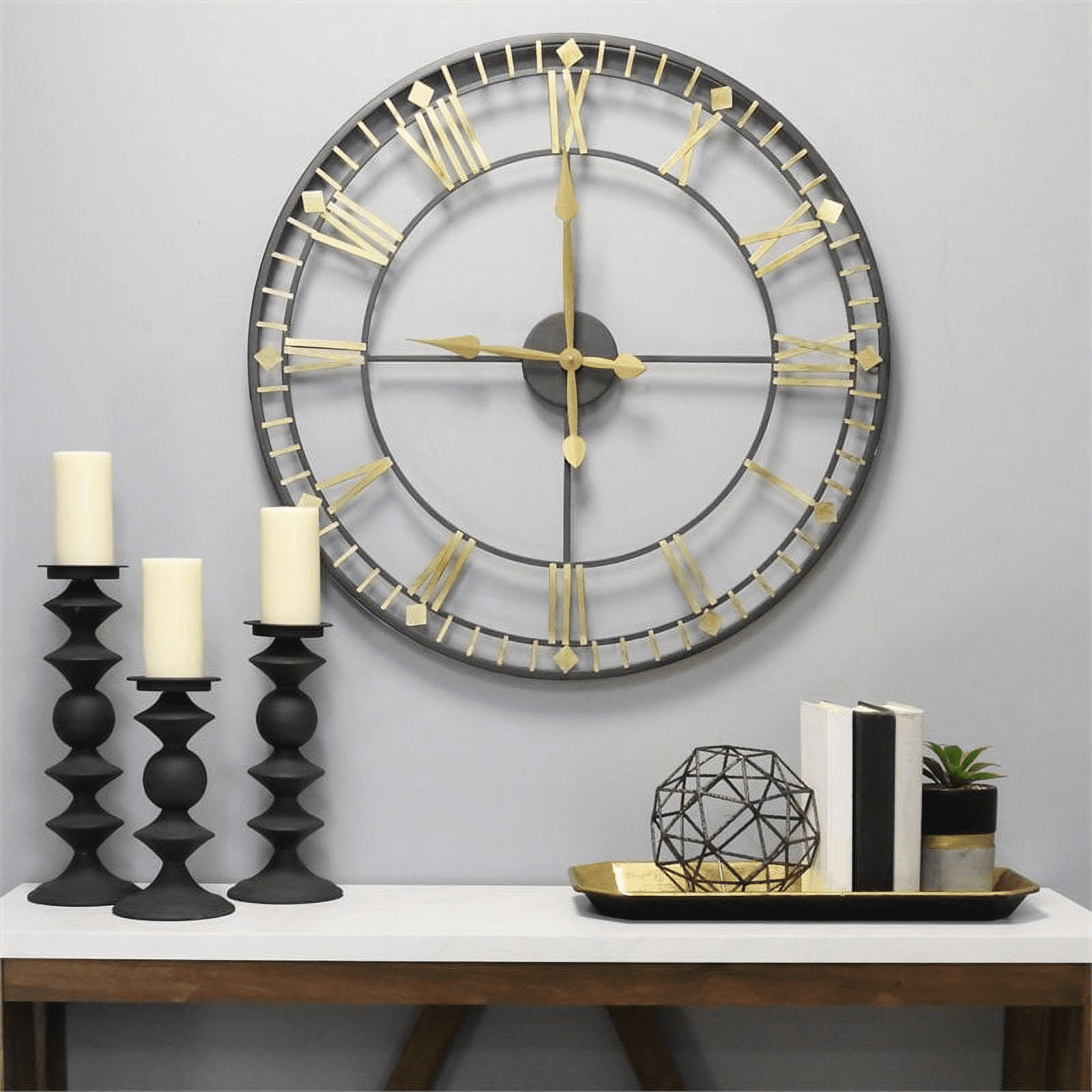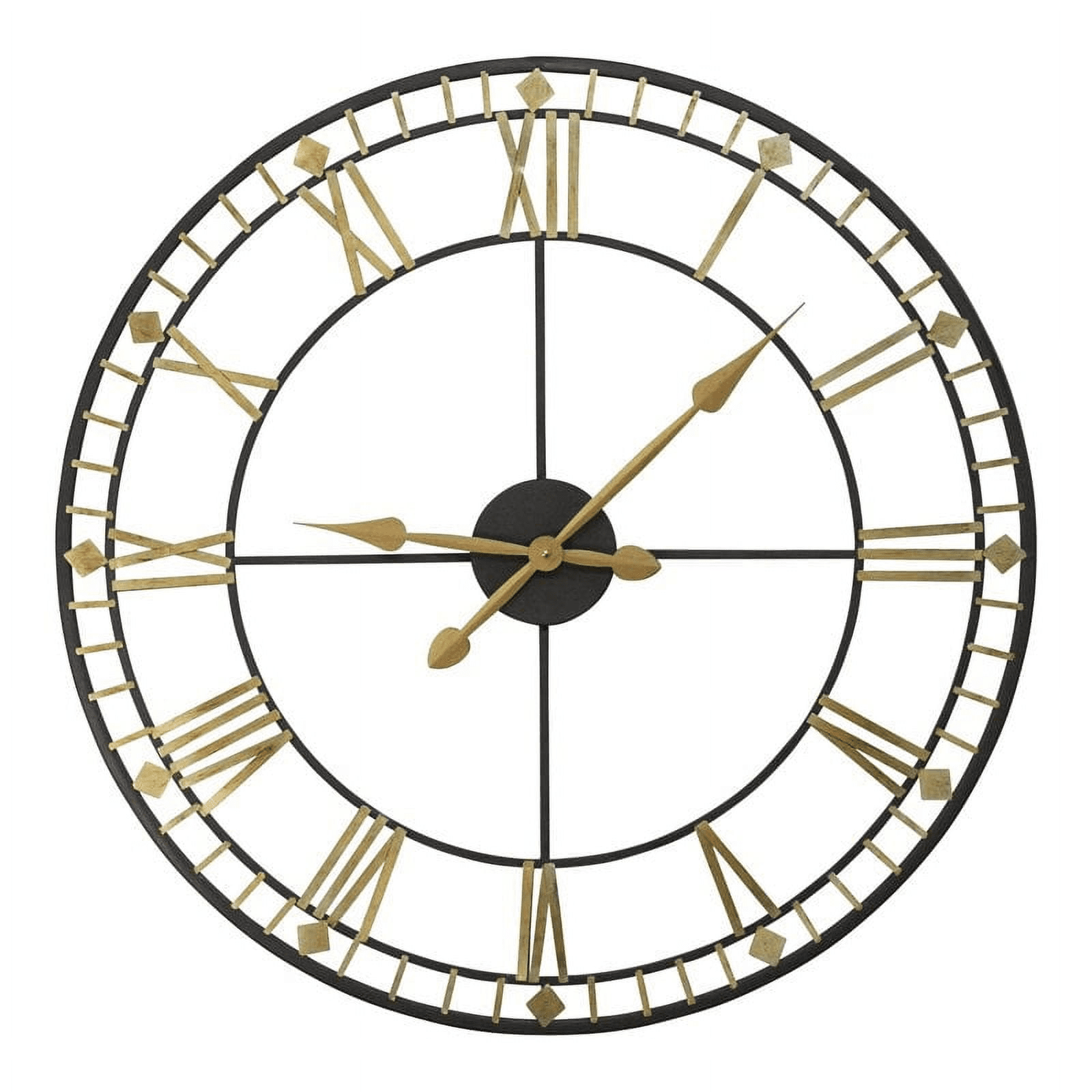 The oversized 31.50" inj2:t2ial austin wall clock by stratton home decor is a stunning combination of modern style and vintage appeal. The handcrafted metal clock with 28" diameter face stands out on any wall with an open-back design in black and gold and sleek roman numerals. It is engineered with quartz movement to ensure accurate timekeeping and comes ready to hang. Measures 31.50" w x 1.38" d x 31.50" h overall and the clock face measures 28" in diameter. Requires 1 aa battery (not included).