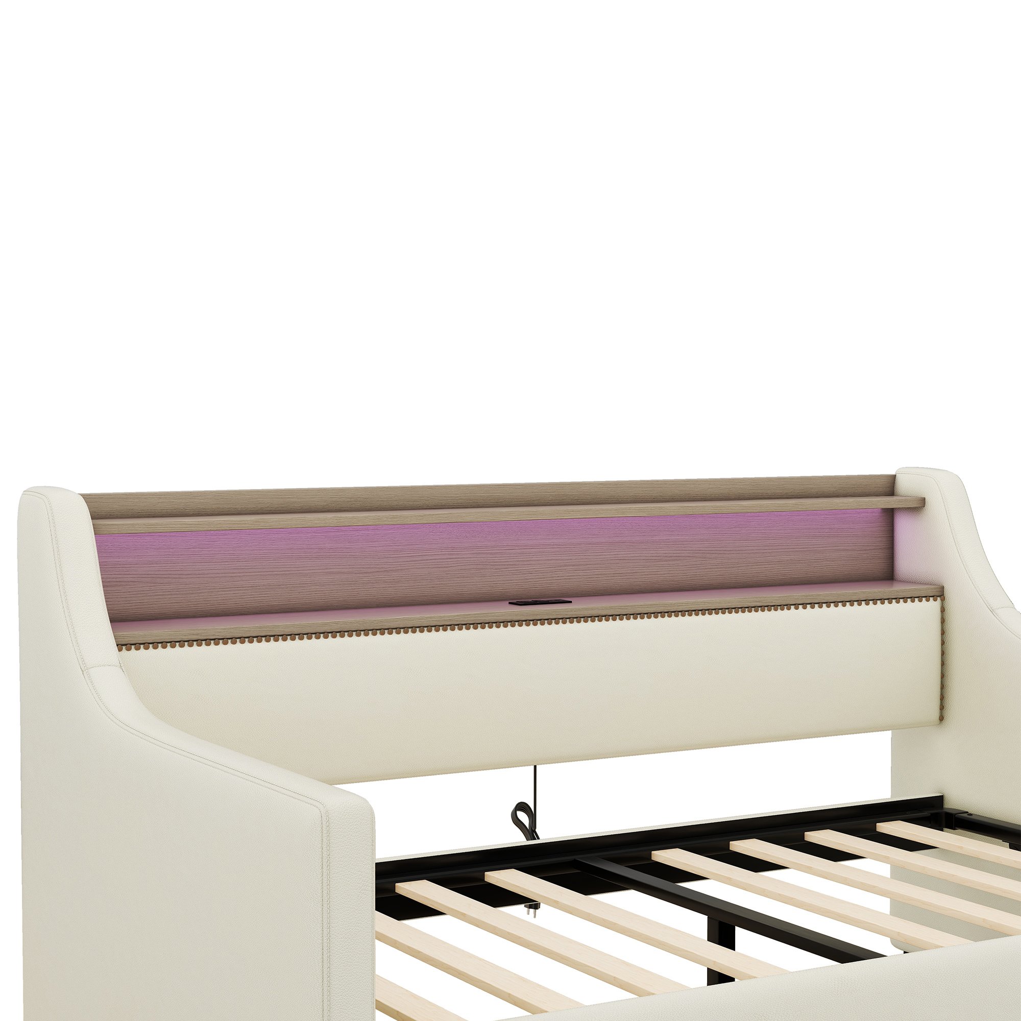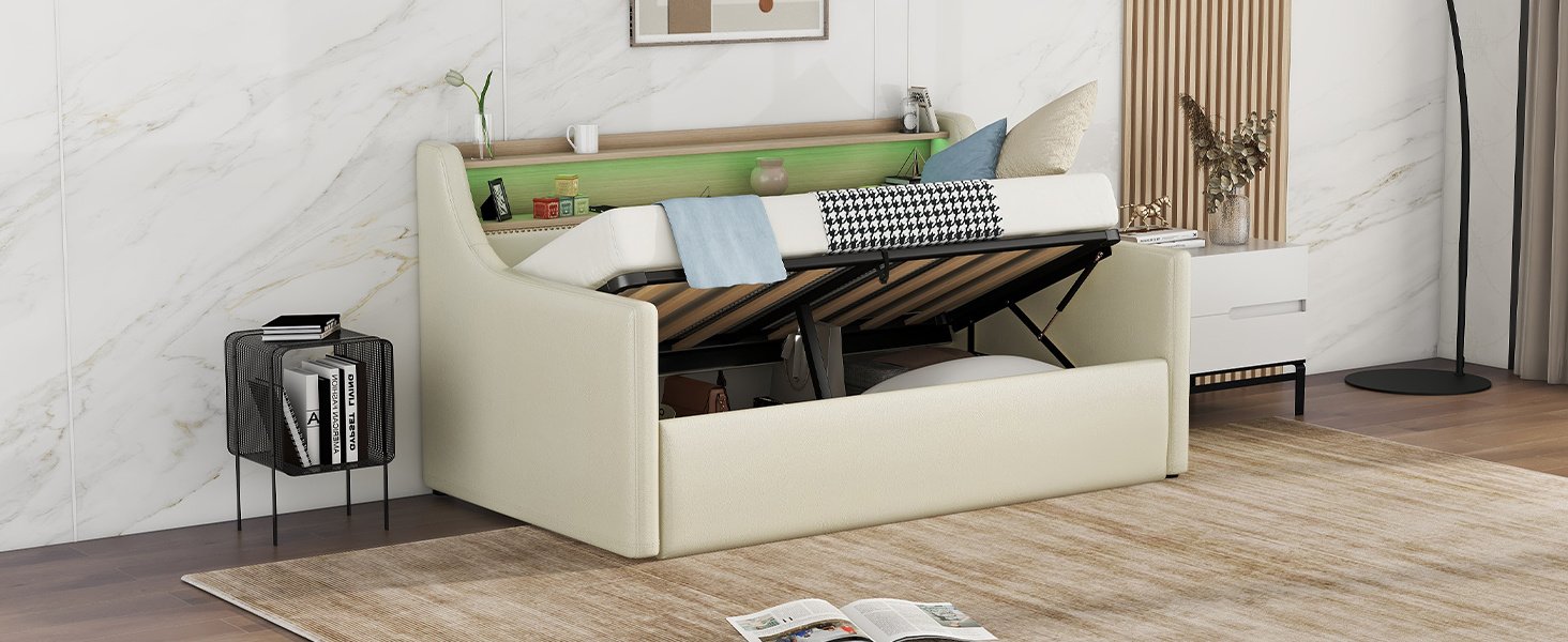 Home > Twin Size Daybed with Hydraulic Storage, Upholstered Daybed with Lift Up Storage, Twin Leather Daybed with Charging Station and LED Lights,Beige